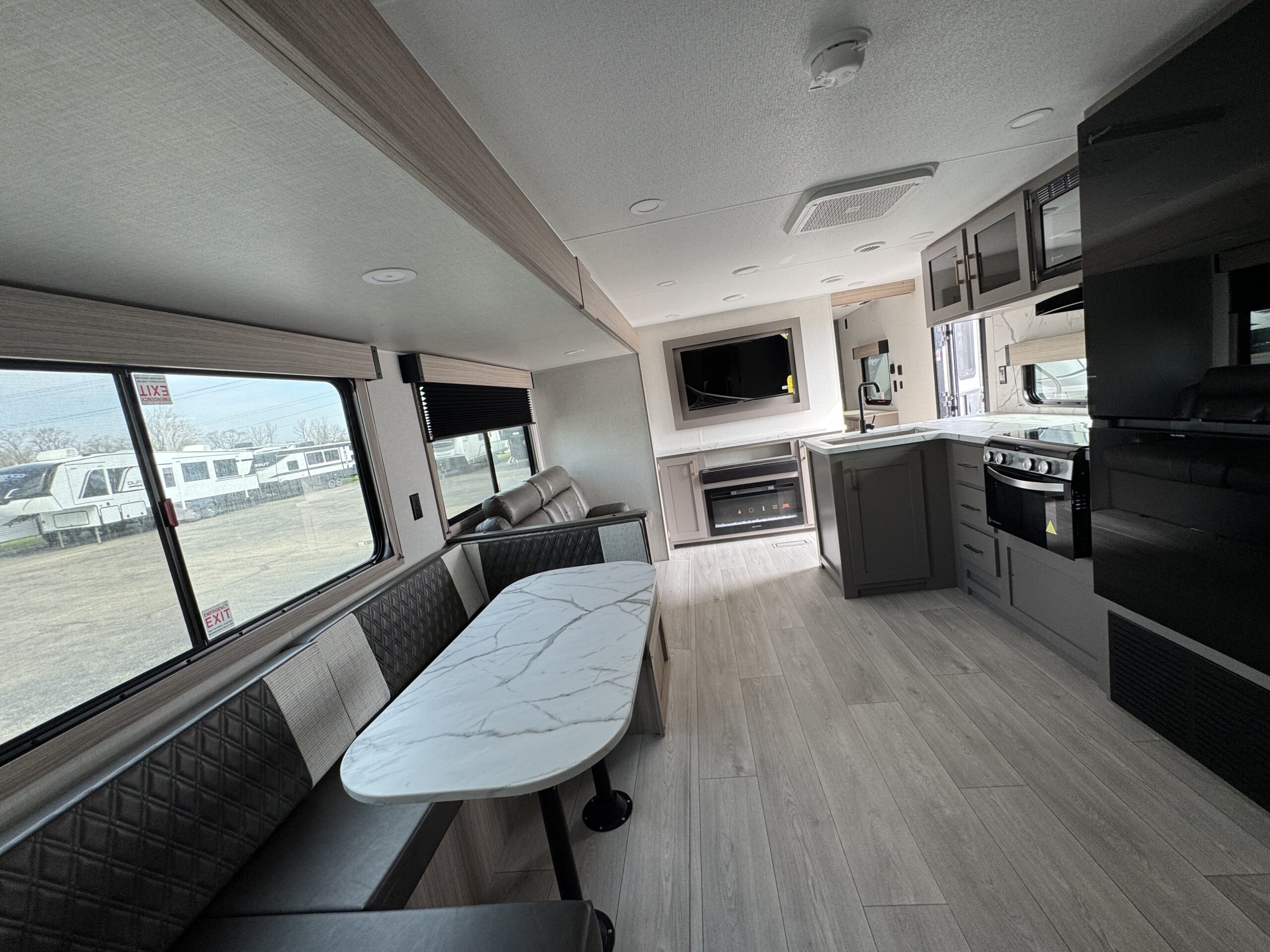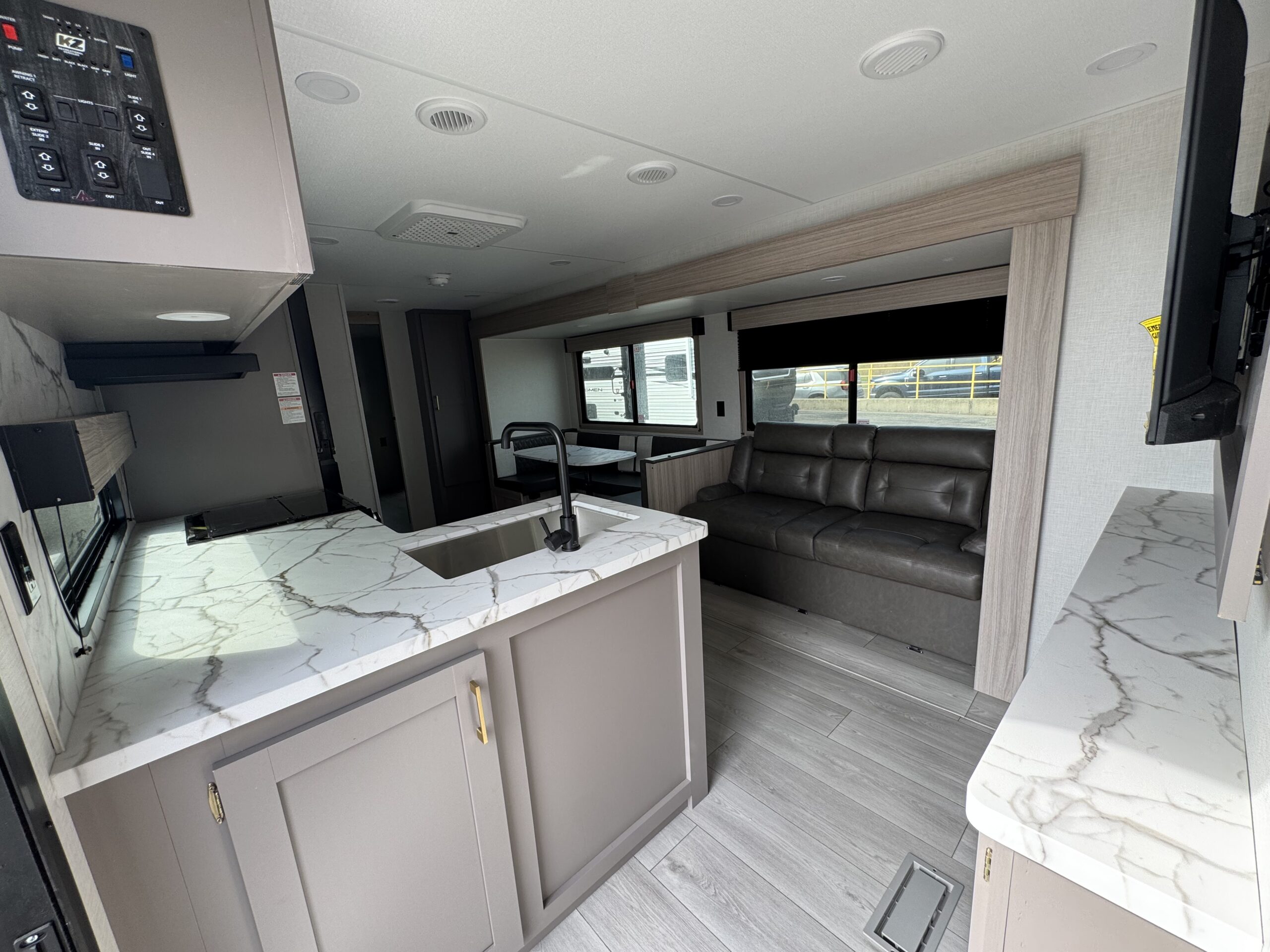 The large slide-out creates a wide-open living space with a comfortable dinette and sofa. Whether you’re eating, relaxing, or just enjoying a rainy day indoors, there’s room for everyone.