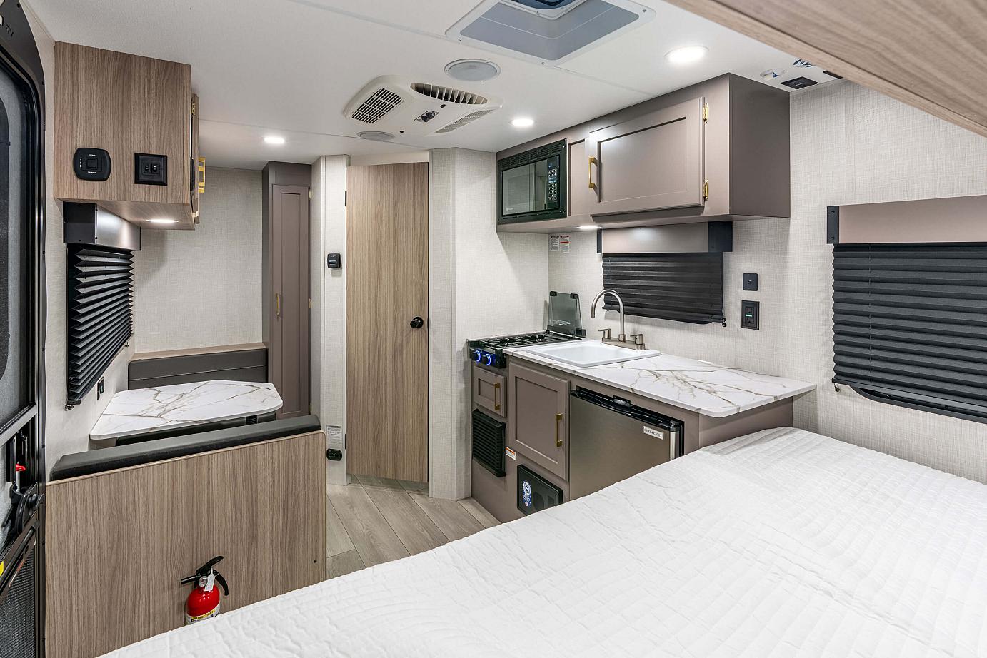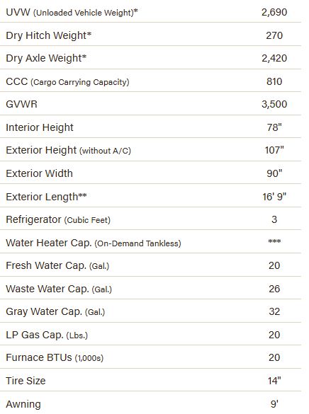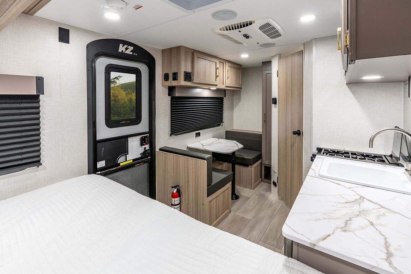 KZ Exclusive Tough Shield .024 Exterior Metal, R-7* Insulation in Sidewalls, Front Diamond Plate, Tinted Windows, Radial Tires, Self-Adjust Electric Brakes, Digital TV Antenna, Cable Hookup, City Water Fill, 12V Converter w/Charger, LP Tank, Shower & Toilet, 42,000 BTU Tankless Hot Water Heater, Rail-Style Cabinet Doors w/Modern Handles, Overhead Cabinets, Tank Monitor Panel, Flush Mount 2 Burner Cooktop w/Glass Top, Microwave, 8 CU FT 12V Refrigerator, Single-Bowl Sink, 3/8″ Fully Walkable Roof, 1-Piece Seamless Tufflex Material w/Lifetime Warranty, 5/8″ Tongue & Groove Plywood Floor, Power Awning, Key-Alike Program for Baggage & Entry Doors, Exterior Speakers, Spare Tire & Carrier, Nitrogen Filled Tires, (4) Scissor Style Stabilizer Jacks, New Two-Toned Exterior Metal, Solar Prep, Backup Camera Prep, Leash Latch w/Bonus Beverage Opener, 13.5 Top Mounted A/C, 2 Burner Cooktop w/Glass Cover, Microwave, Pressed Countertops, 8 CU FT 12V Refrigerator (most models), 20,000 BTU Furnace, Foot Flush Toilet, 2) 6.5″ Interior Speakers, Digital Media Stereo w/Bluetooth, USB Port, Flush Mounted LED Ceiling Lights, Full Glass Entry Door w/Shade Prep, Screenshot & Screen Defender, Omnidirectional HDTV Antenna w/Wi-Fi Prep, Residential Grade Linoleum, Rail Style Cabinet Doors, Interior Control Switches on Overhead End Cabinet