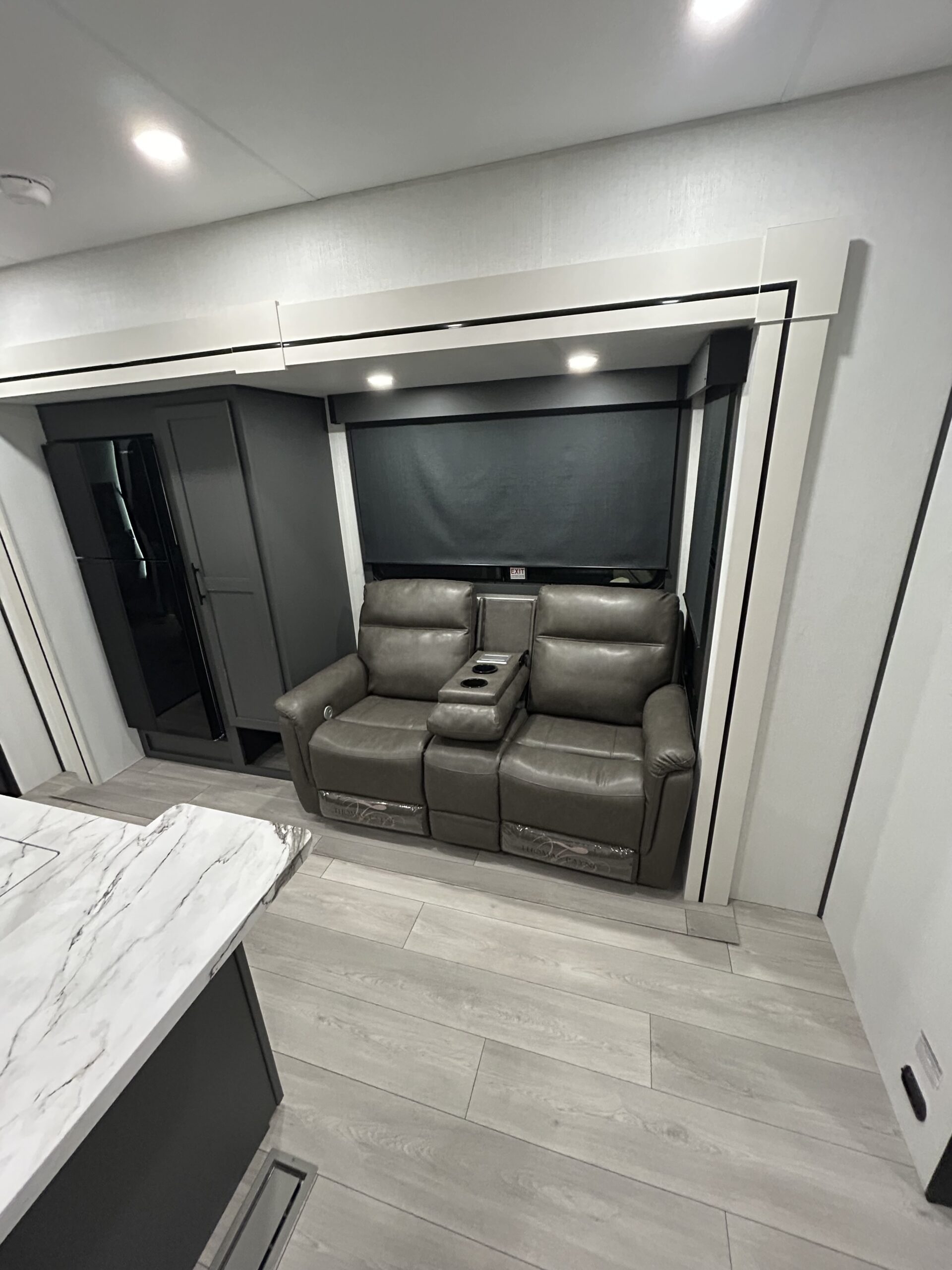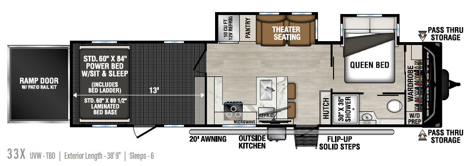 Ramp door patio kit, rear awning, collapsible ladder, and power awnings with LED strips for effortless outdoor living