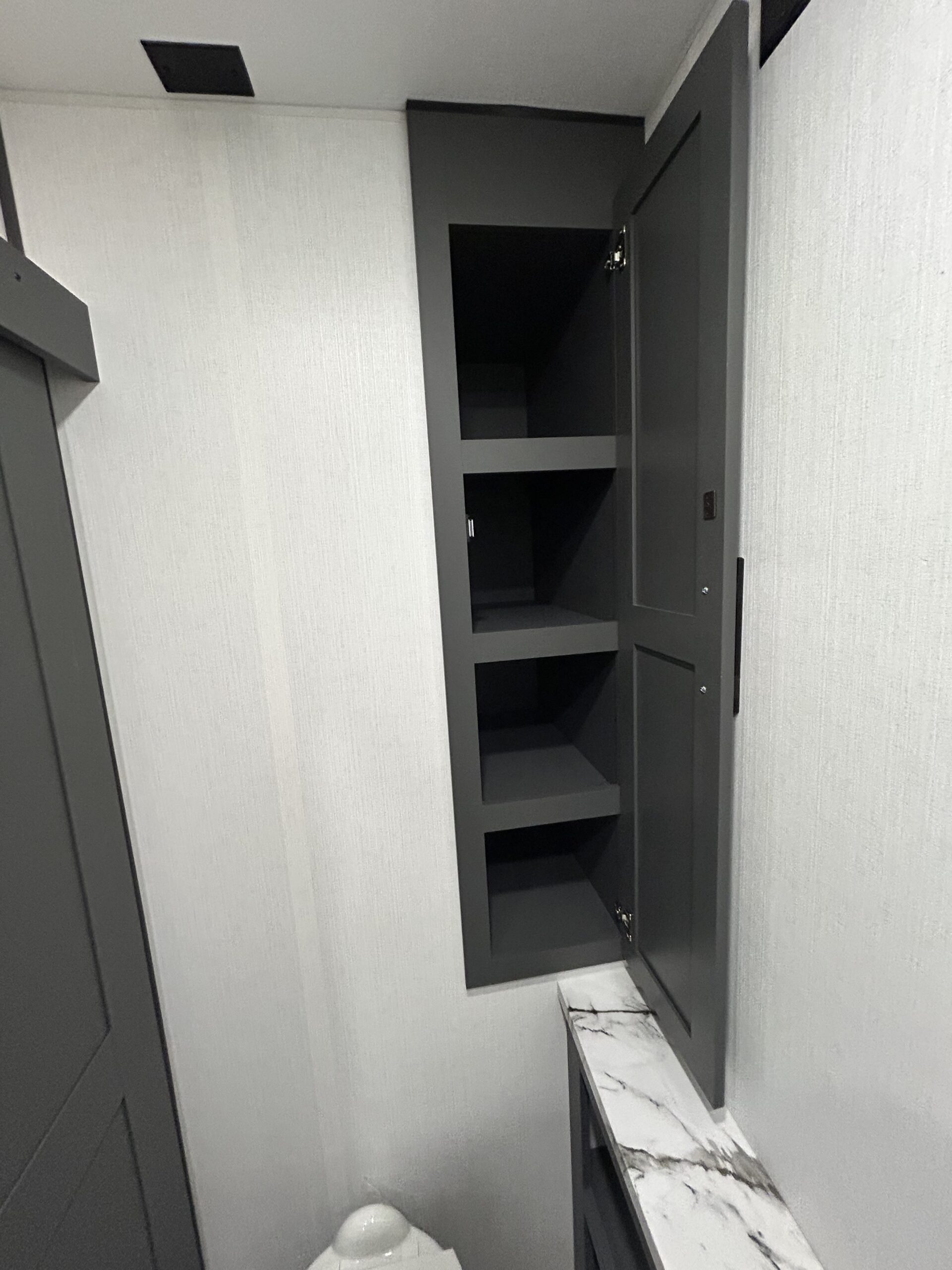 Triple-entry pass-through mega storage with felt-lined finish, powder-coated shelves, and LED lighting